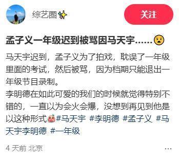 原来是之前在一档综艺中,因为孟子义要和马天宇合作拍一场戏,但没想到马天宇迟迟不来,而孟子义接下来还有行程安排,心急如焚,尝试沟通能不能先不拍了。