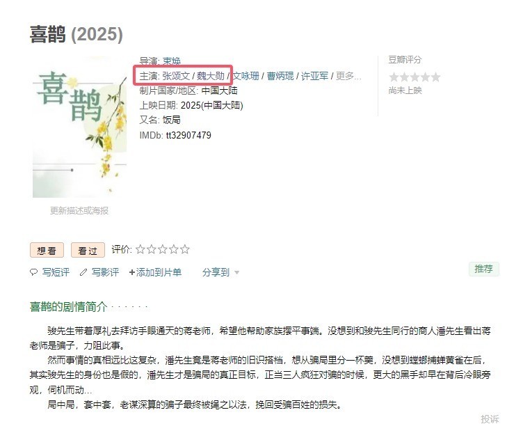 而为啥魏大勋会那么难受呢?这就要说到今年魏大勋的一部拳头作品《喜鹊》了,今年的魏大勋就靠着两部作品来保证自己的热度,一部是叫《无罪之身》的电影,这部电影是自己的主演作品,而另外一部就是和张颂文合作的喜鹊了,本以为魏大勋这一次搭上了张颂文这条线,自己的日子应该稳了,最起码不需要担心作品问题了。